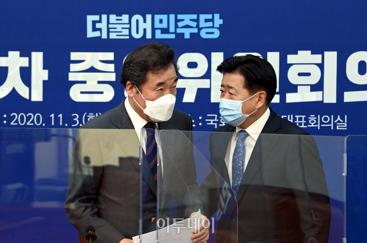 3일 오전 국회에서 열린 더불어민주당 중앙위원회의에서 이낙연 대표가 오영훈 비서실장과 현안을 논의하고 있다.