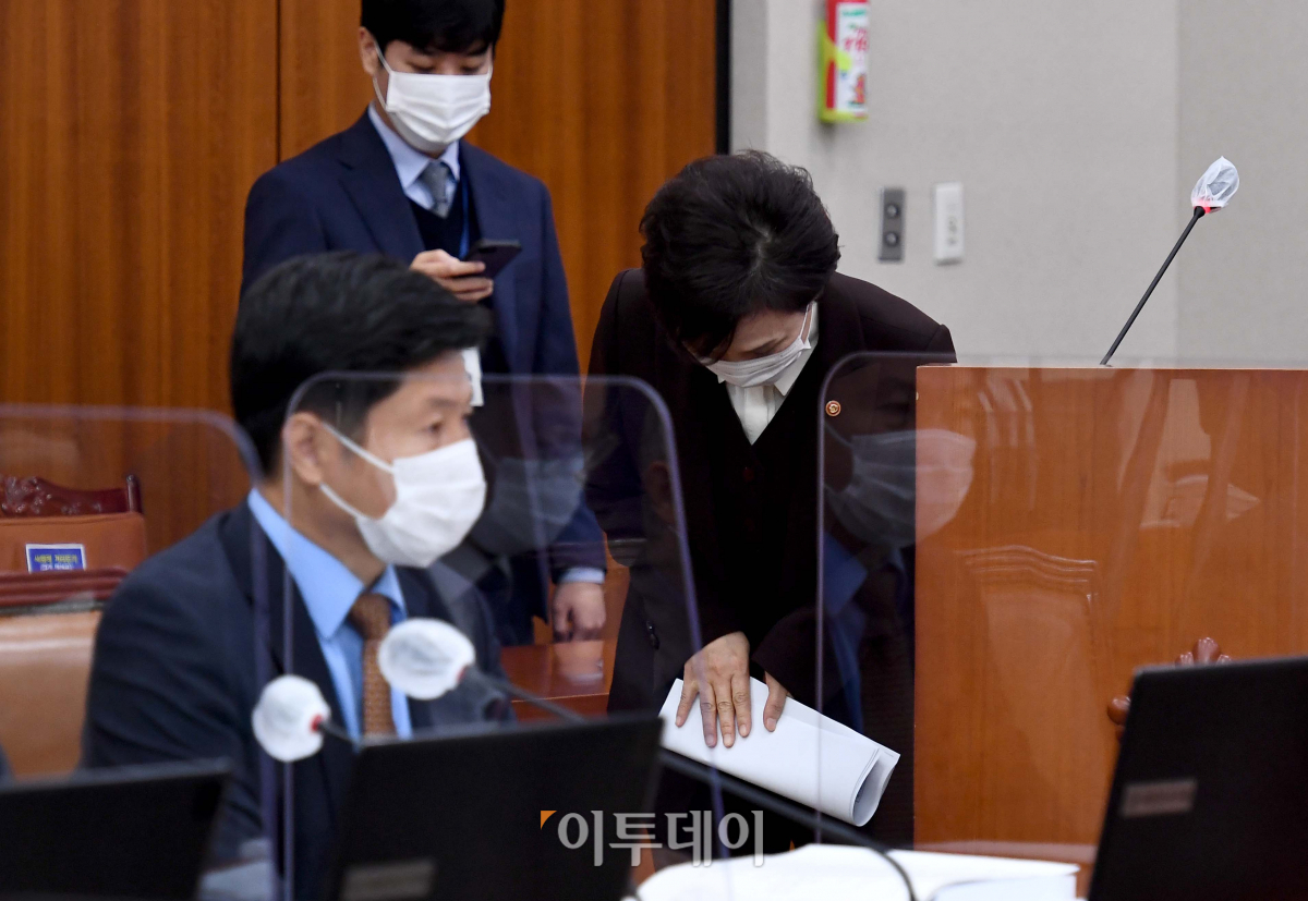 김현미 국토교통부 장관이 3일 서울 여의도 국회에서 열린 국토교통위원회 전체회의에서 제안설명을 마친 뒤 인사하고 있다.
