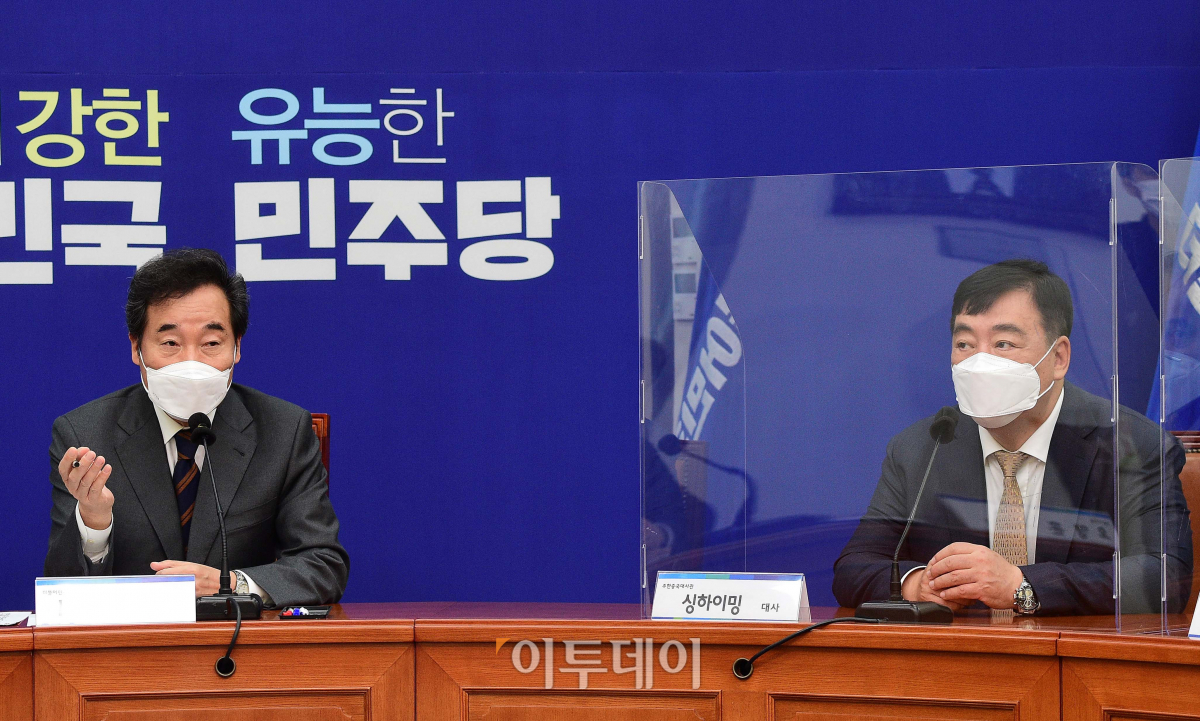 이낙연 더불어민주당 대표가 3일 국회를 찾은 싱하이밍 주한중국대사와 환담을 나누고 있다.