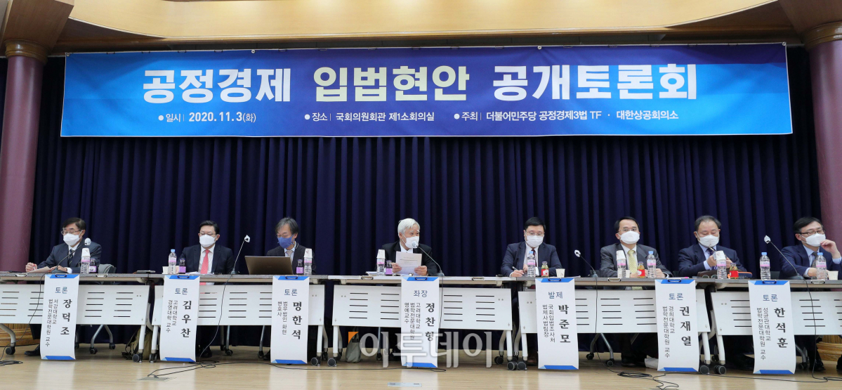 3일 국회에서 열린 공정경제 3법 입법 현안 공개 토론회에 참석한 정찬영 고려대 법학전문대학교 교수가 토론회를 주재하고 있다.