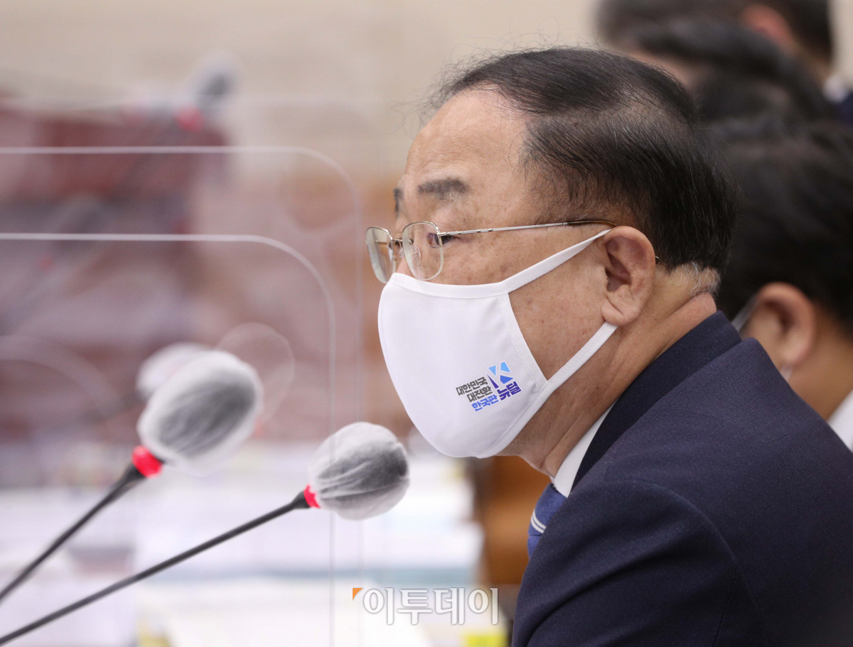 홍남기 경제부총리 겸 기획재정부 장관이 3일 오후 서울 여의도 국회에서 열린 기획재정위원회 전체회의에서 의원들의 질의에 답변하고 있다.