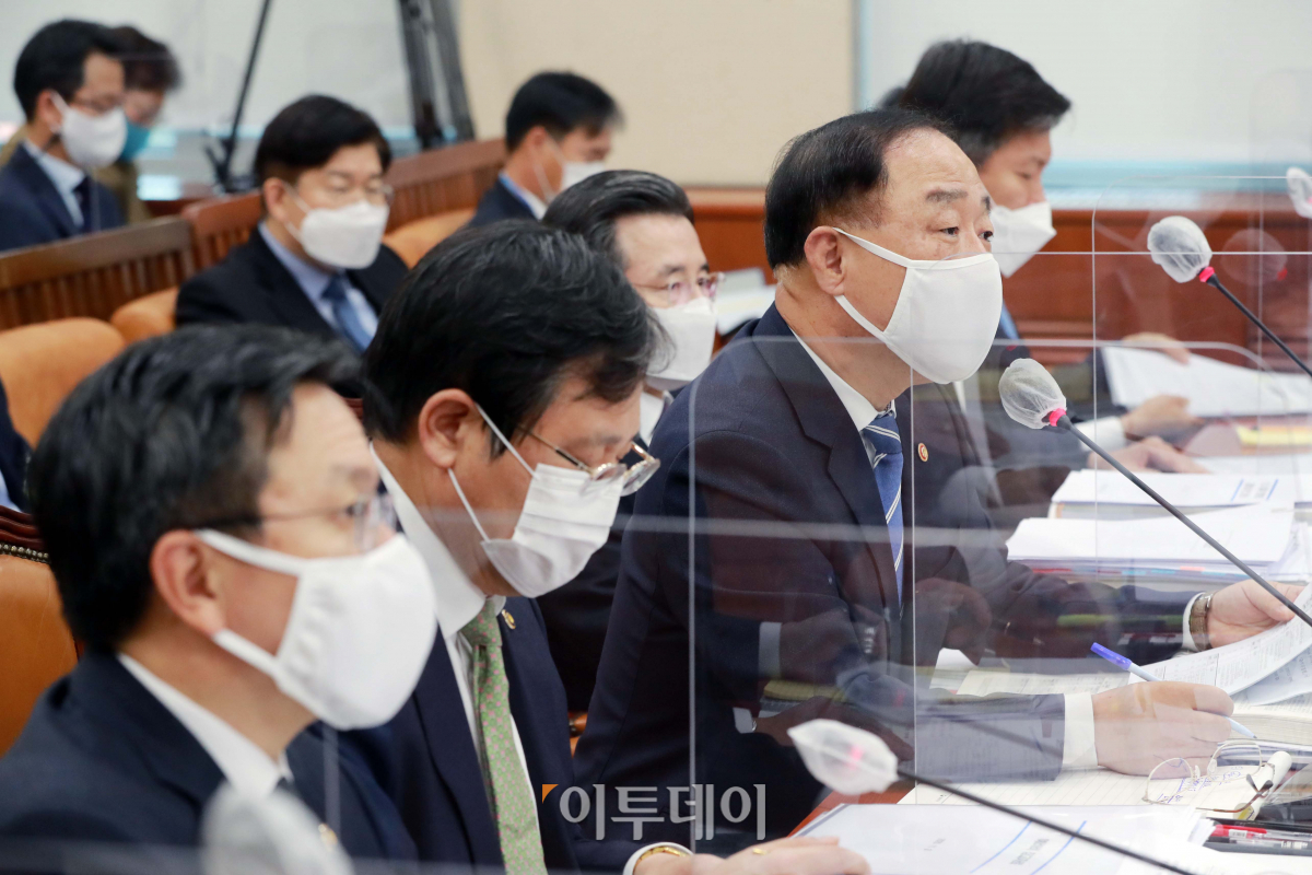 홍남기 부총리 겸 기획재정부 장관이 3일 오후 서울 여의도 국회에서 열린 기획재정위원회 전체회의에서 질의에 답하고 있다.