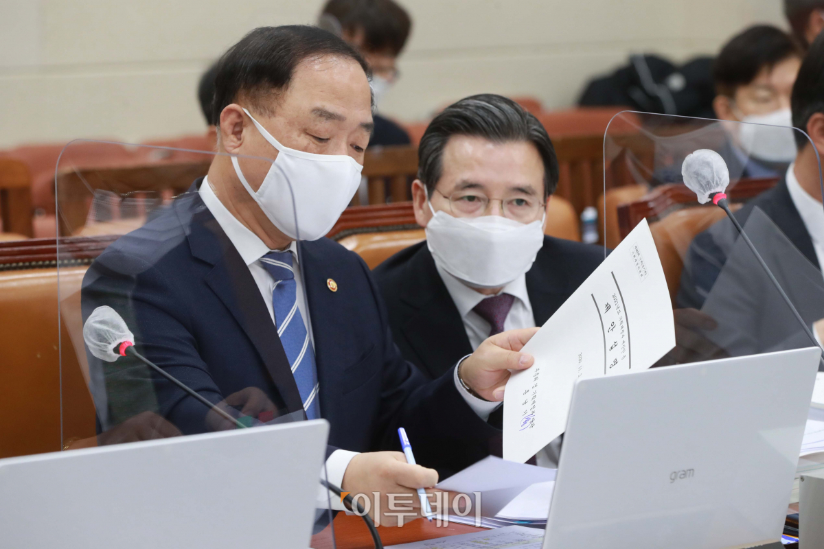 홍남기 부총리 겸 기획재정부 장관과 김용범 1차관이 3일 오후 서울 여의도 국회에서 열린 기획재정위원회 전체회의에서 대화를 나누고 있다.