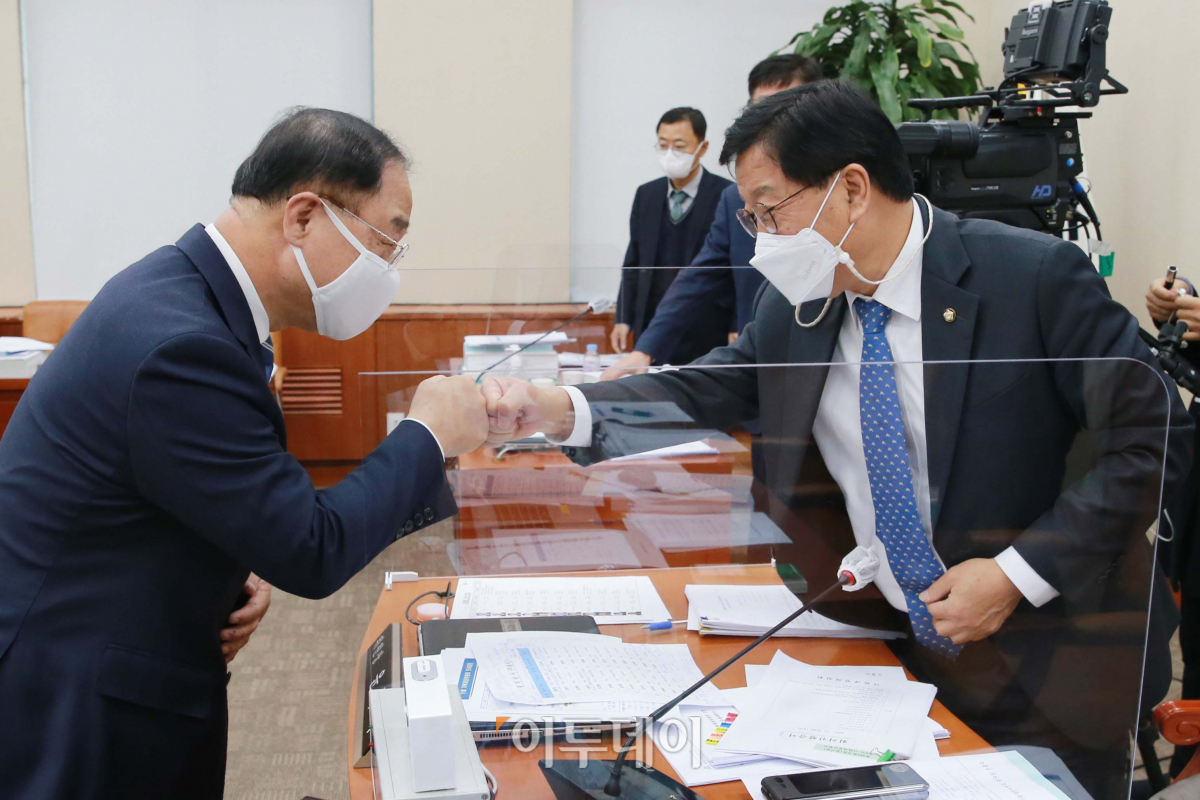 홍남기 부총리 겸 기획재정부 장관이 3일 오후 서울 여의도 국회에서 기획재정위원회 전체회의를 마치고 윤후덕 위원장과 주먹인사를 하고 있다.