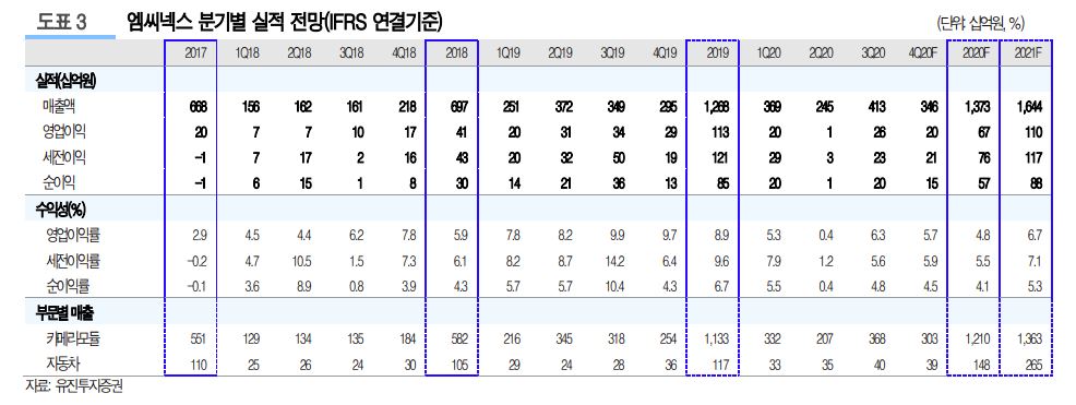 유진투자증권은 4일 엠씨넥스에 대해 2021년부터 자율주행과 전장용카메라 등 전장부품의 공급이 늘면서 수익성 개선에 기여할 것이라며 목표주가 4만 원과 투자의견 '매수'를 유지했다.