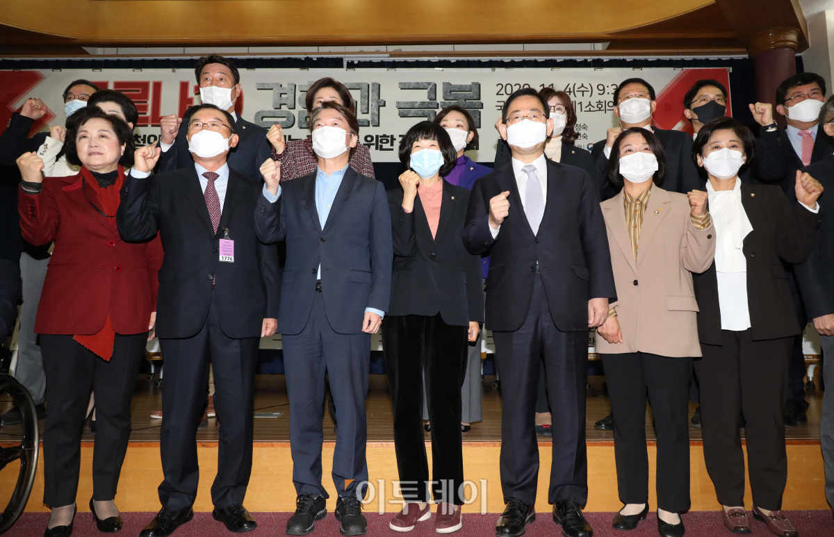 4일 국회 의원회관에서 최연숙.서정숙 의원실 주최로 열린 '코로나19 경험과 극복' 정책토론회에서 국민의당 안철수 대표와 국민의힘 주호영 원내대표 등 참석자들이 기념촬영을 하며 화이팅을 외치고 있다.