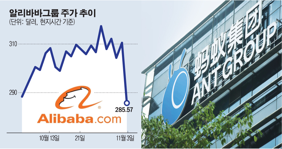사상 최대 규모로 기대를 모았단 중국 알리바바그룹 산하 핀테크 기업 앤트그룹의 기업공개(IPO)가 연기되면서 후폭풍이 거세다. 중국 당국이 앤트의 영향력 확대를 경계해 IPO에 제동을 걸면서 글로벌 투자자 사이에 중국 시장에 대한 불신감이 커지고 있다. 모회사 알리바바그룹 주가가 폭락한 것은 물론 창업자 마윈의 자산도 하루 만에 28억 달러(약 3조 원)나 쪼그라들었다.