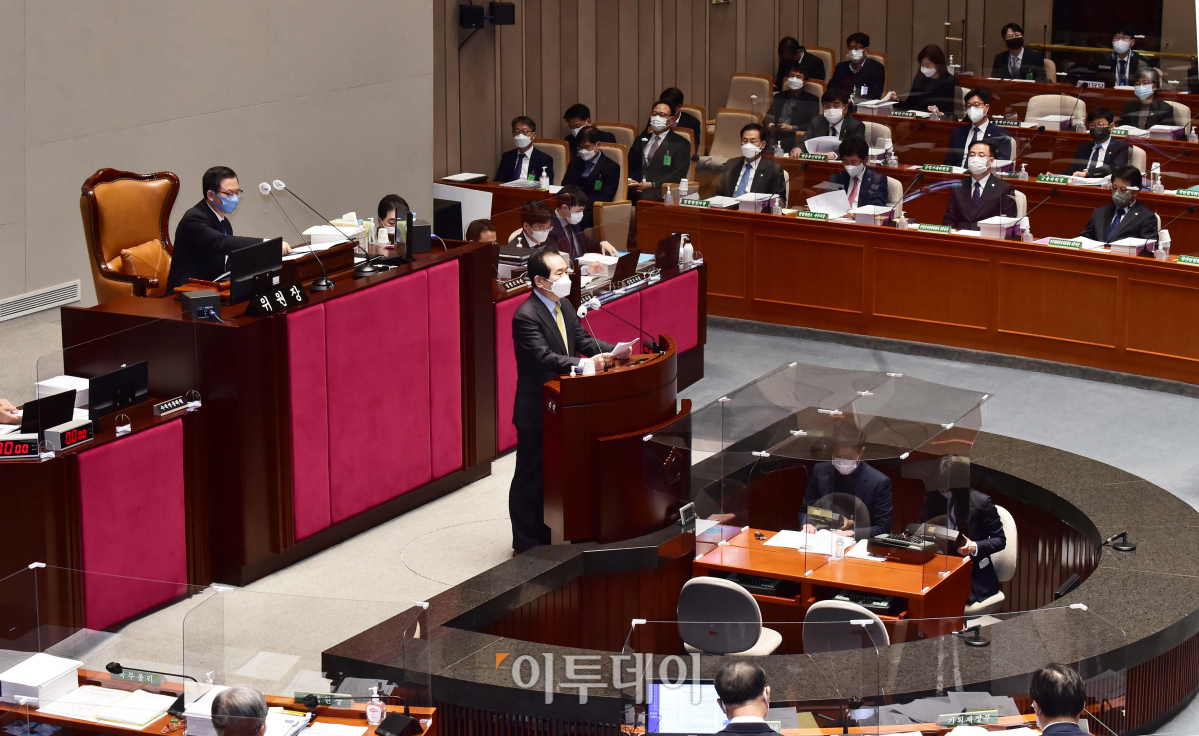 정세균 국무총리가 4일 서울 여의도 국회 본관 예결위 회의장에서 열린 2021년도 정부 예산안 관련 전체회의에서 예산안 연설을 하고 있다.