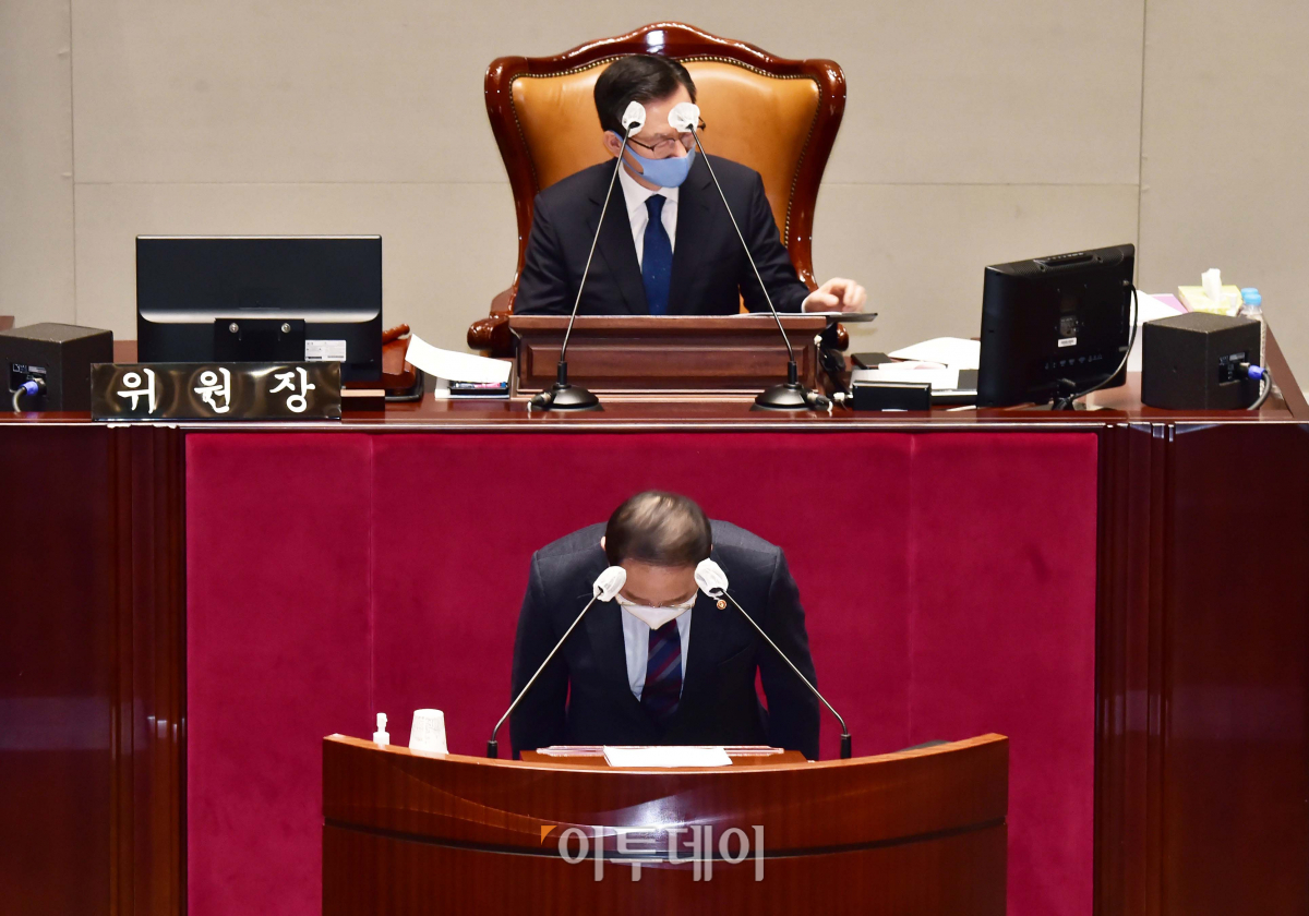홍남기 경제부총리 겸 기획재정부 장관이 4일 서울 여의도 국회 본관 예결위 회의장에서 열린 2021년도 정부 예산안 관련 전체회의에서 예산안 설명을 하기 앞서 고개숙여 인사하고 있다.