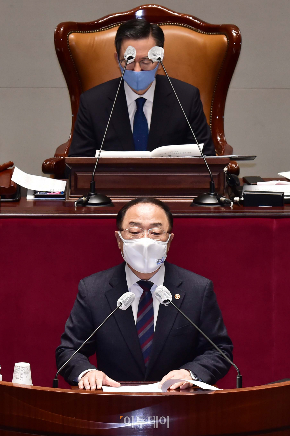 홍남기 경제부총리 겸 기획재정부 장관이 4일 서울 여의도 국회 본관 예결위 회의장에서 열린 2021년도 정부 예산안 관련 전체회의에서 예산안 설명을 하고 있다.