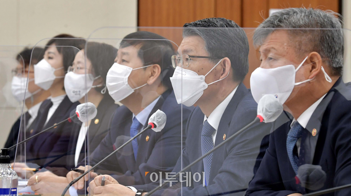 박삼득 국가보훈처장(오른쪽부터)와 은성수 금융위원장, 구윤철 국무조정실장 등이 서울 여의도 국회에서 열린 정무위원회 전체회의에 참석해 질의를 받고 있다.