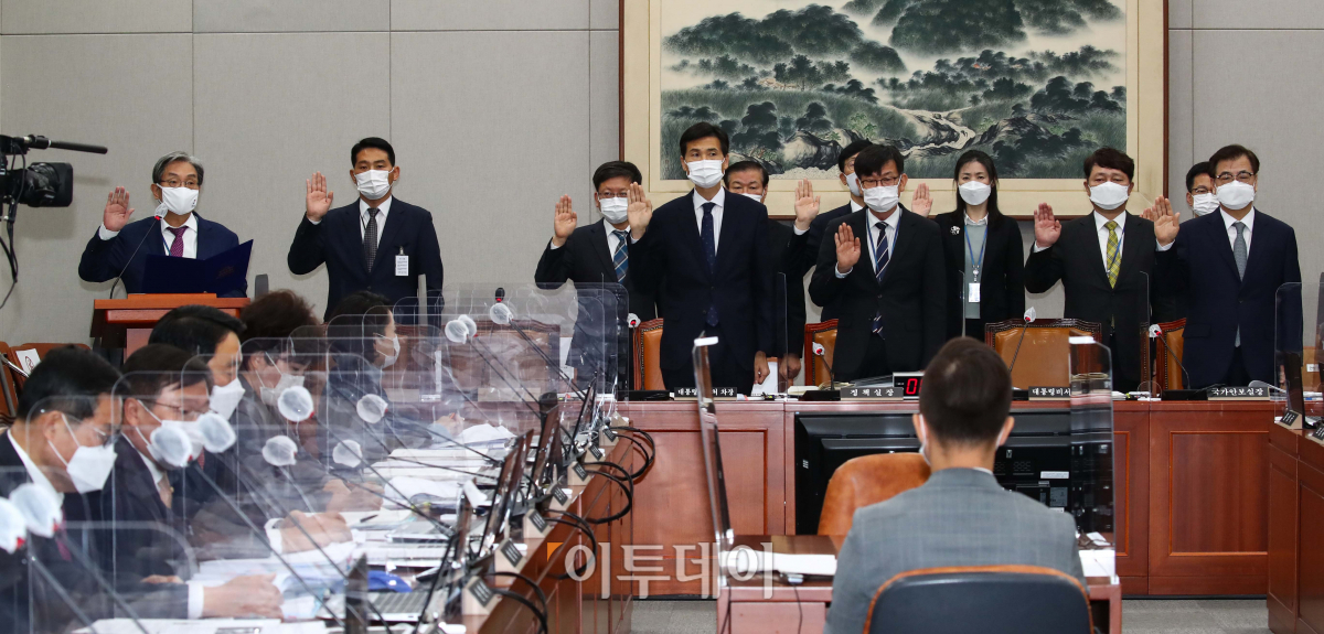 노영민 청와대 비서실장과 서훈 국가안보실장, 김상조 청와대 정책실장 등 참석자들 4일 오전 국회에서 열린 운영위원회 청와대 대통령비서실, 국가안보실, 대통령경호처에 대한 국정감사에서 선서를 하고 있다.