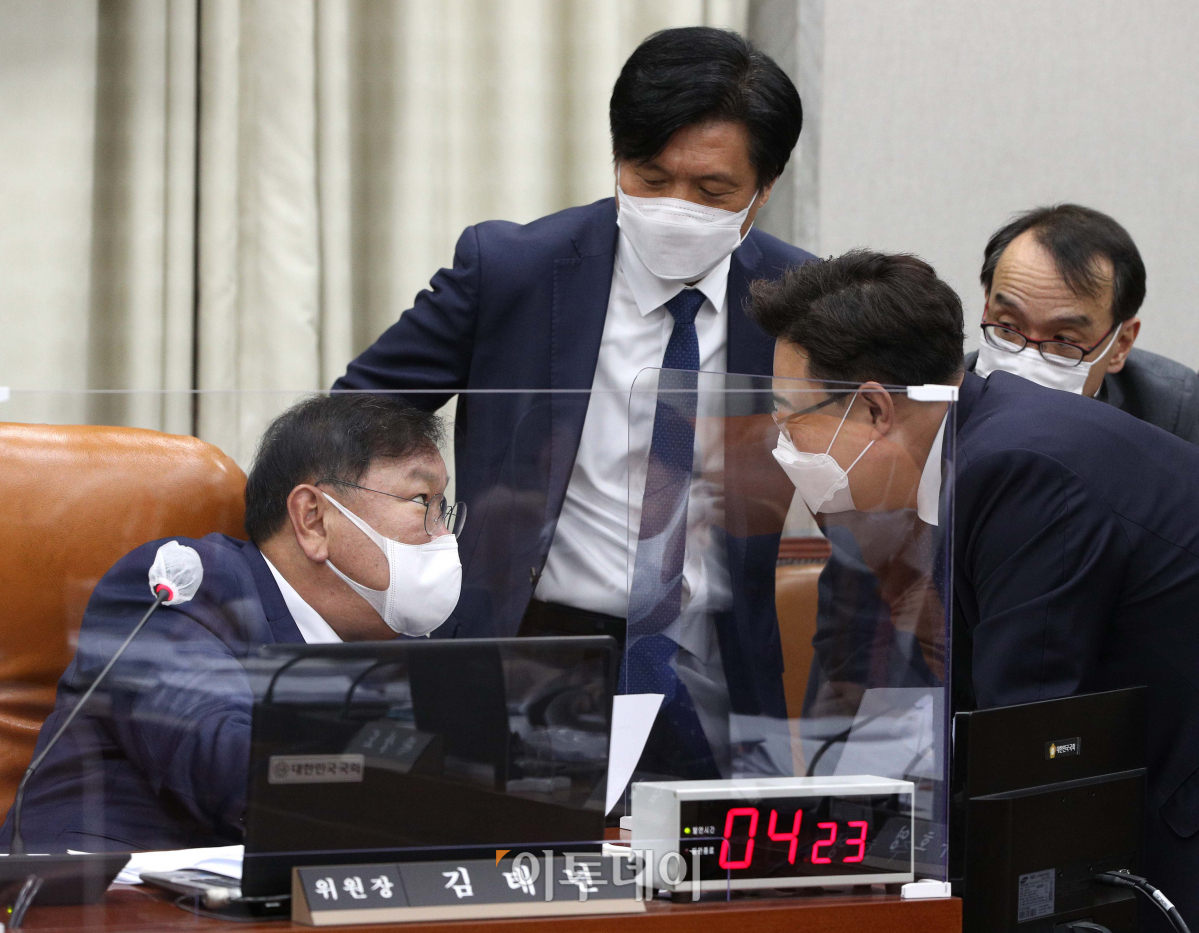김태년 위원장(왼쪽)과 김성원 국민의힘 간사가 4일 오전 서울 여의도 국회에서 열린 국회운영위원회의 청와대 대통령비서실·국가안보실·대통령경호처에 대한 국정감사에서 대화하고 있다.