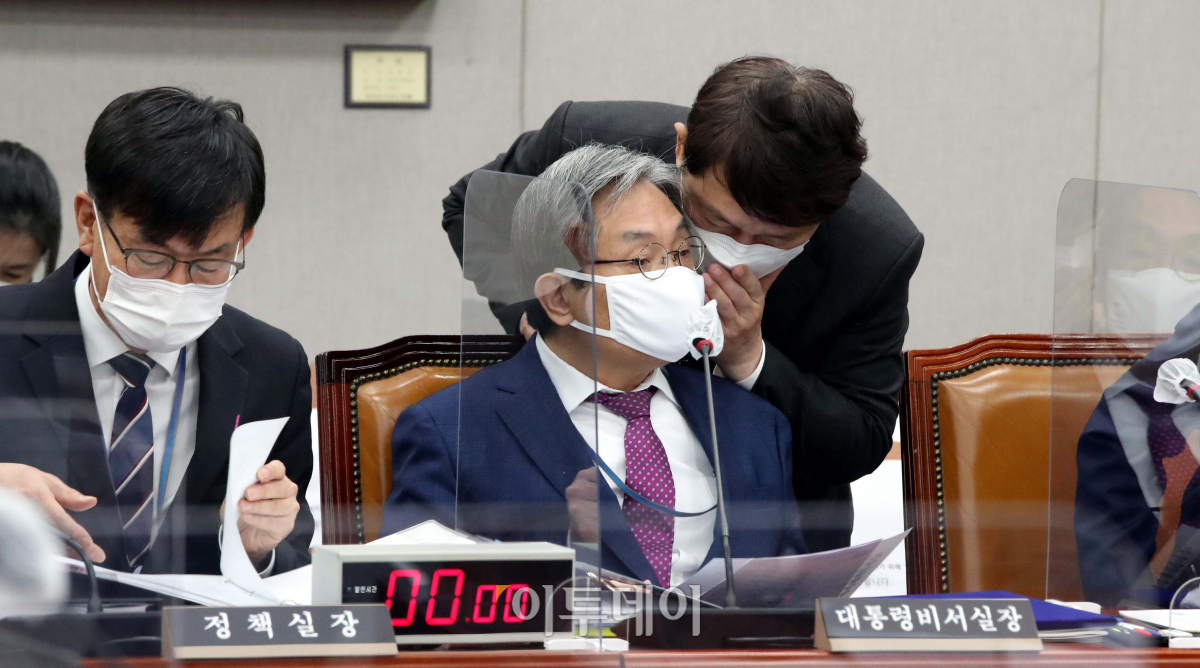 4일 오전 국회에서 열린 운영위 국정감상에 출석한 노영민 청와대 비서실장이 최재성 정무수석과 귓엣말을 하고 있다.