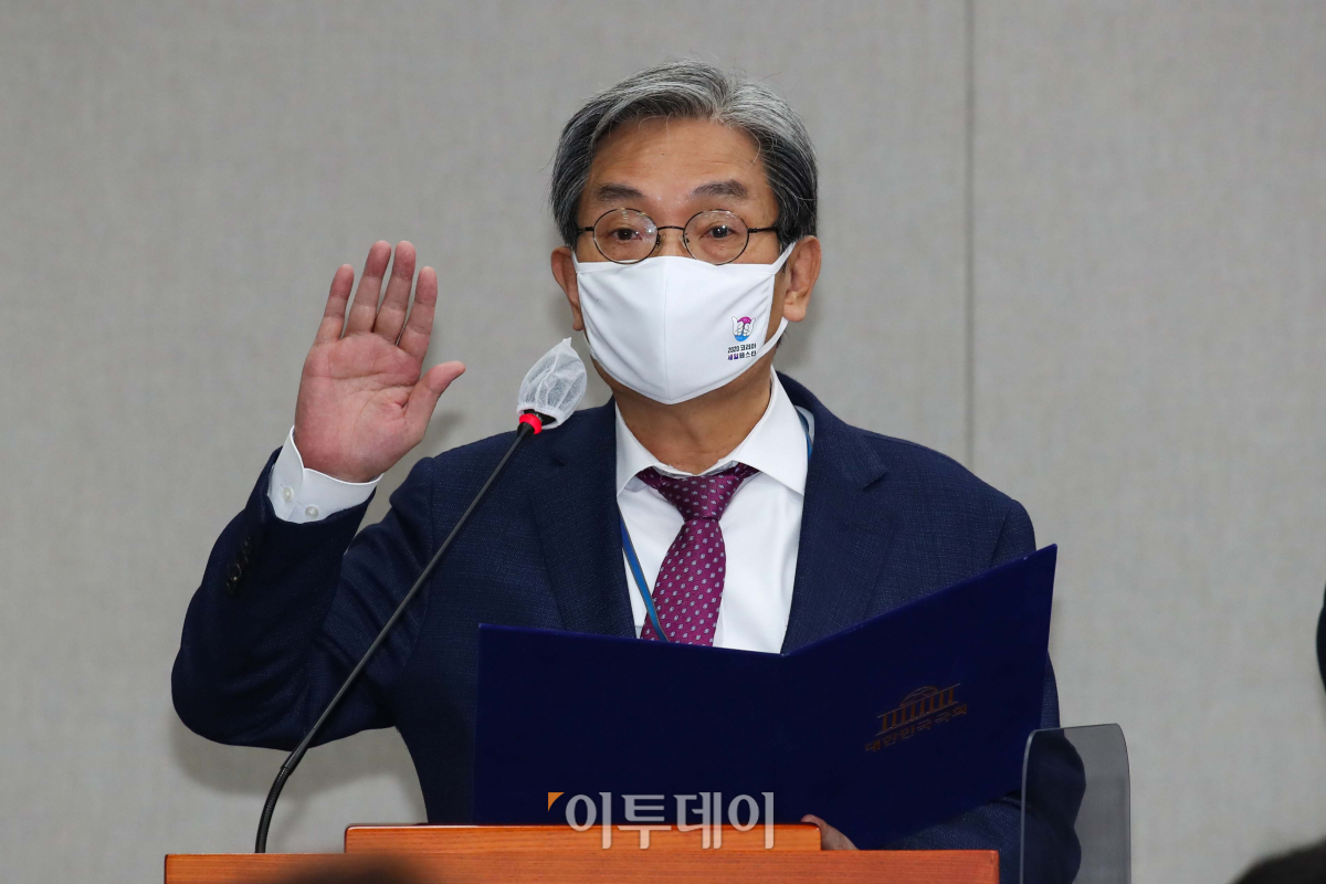 노영민 청와대 비서실장이 4일 오전 국회에서 열린 운영위원회 청와대 대통령비서실, 국가안보실, 대통령경호처에 대한 국정감사에서 선서를 하고 있다.