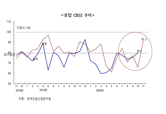 건산연은 이달 CBSI가 91.3로 10월보다 11.4P 올라갈 것으로 예상했다. 업황 개선과 경기 부양을 위한 공사 발주 증가에 대한 기대가 반영됐다.