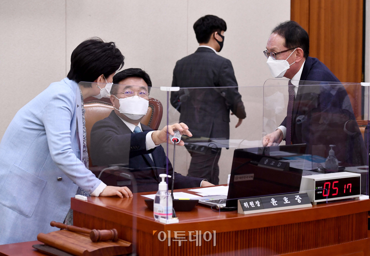 5일 서울 여의도 국회에서 열린 법제사법위원회 전체회의에서 윤호중(가운데) 위원장과 여당 간사인 백혜련(왼쪽) 더불어민주당 의원, 야당 간사인 김도읍 국민의힘 의원이 대화하고 있다.