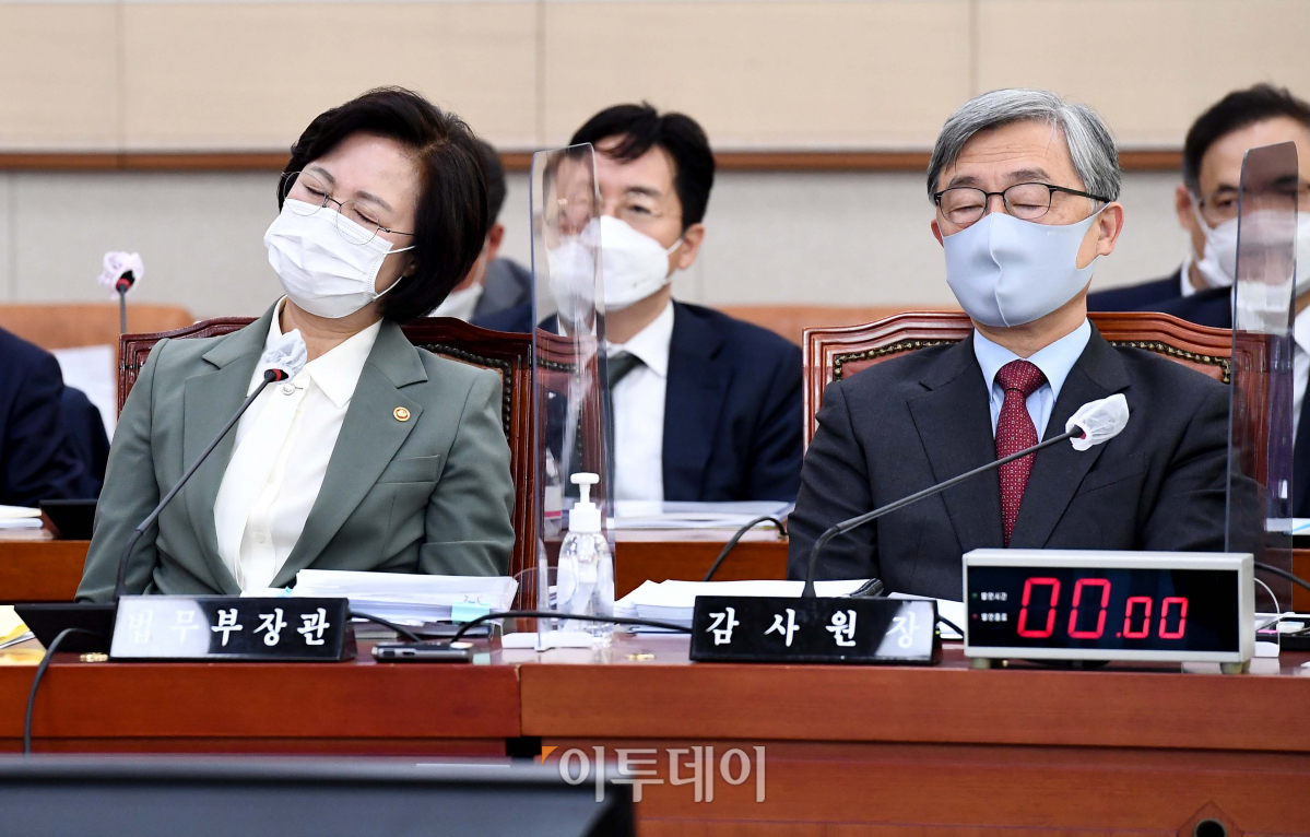추미애(왼쪽) 법무부 장관과 최재형 감사원장이 5일 서울 여의도 국회에서 열린 법제사법위원회 전체회의에서 잠시 눈을 감고 있다.