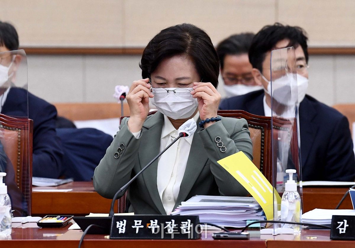 추미애 법무부 장관이 5일 서울 여의도 국회에서 열린 법제사법위원회 전체회의에서 안경을 쓰고 있다.