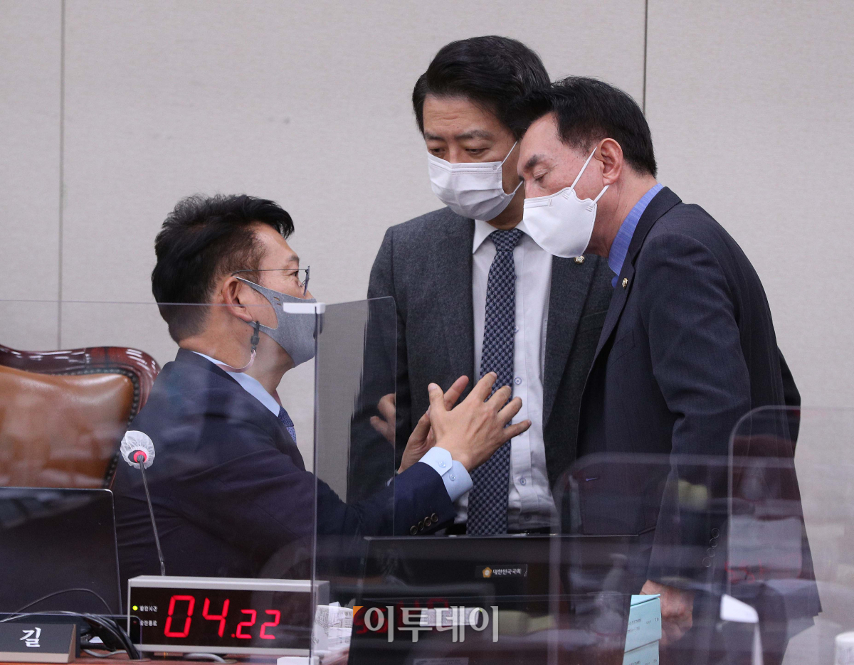 송영길 위원장과 김영호 더불어민주당 간사, 김석기 국민의힘 간사가 5일 오전 서울 여의도 국회에서 열린 외교통일위원회 전체회의에서 대화하고 있다.