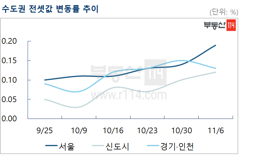 부동산 정보업체 부동산114에 따르면 이번 주 서울 아파트 전셋값은 지난주보다 0.19% 올랐다. 2015년 11월 첫 주(0.21%) 이후 가장 높은 상승률이다. 서울 아파트 전셋값은 지난주에도 연중 가장 높은 상승률(0.14%)을 기록했지만 이번 주엔 오름폭이 더 커졌다.