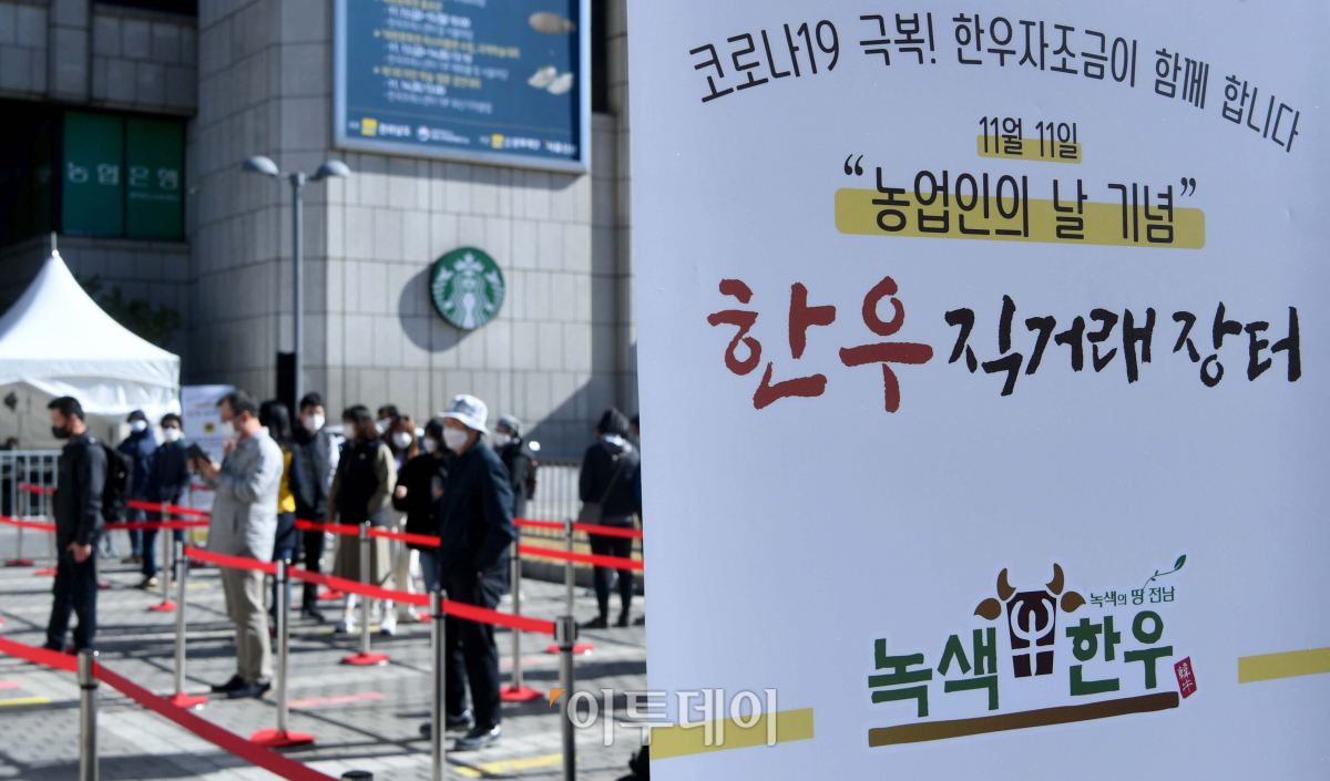 8일 서울 중구 프레스센터 앞에서 한우자조금 주최로 열린 ‘한우직거래장터’를 찾은 시민들이 한우를 구입하기 위해 거리를 둔채 기다리고 있다. 매년 명절에 개최되던 한우직거래장터는 올해 코로나19 영향으로 이날부터 진행됐으며, 사회적 거리두기 준수를 위해 ‘워킹스루’ 형식이 도입됐다. 오는 10일까지 열리는 한우직거래 장터에선 한우를 시중가격대비 30~50% 저렴하게 구매할 수 있다.