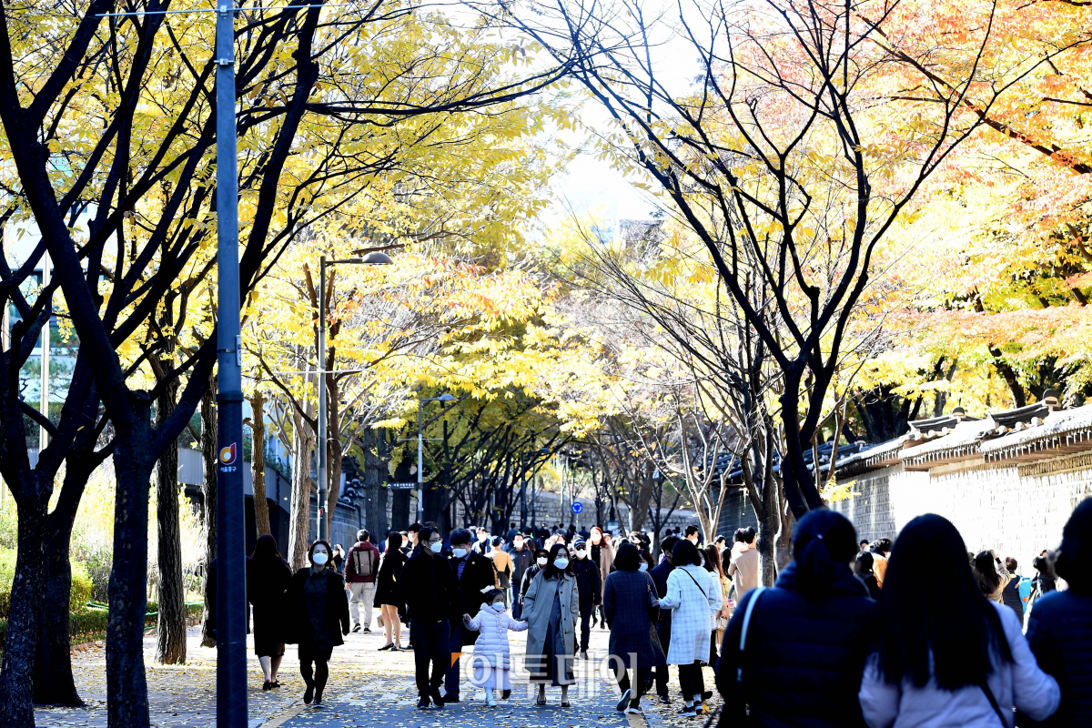 전국이 쌀쌀한 날씨를 보인 8일 시민들이 서울 중구 덕수궁 돌담길을 걸으며 늦가을의 정취를 만끽하고 있다. 기상청은 밤사이 기온이 더 떨어져 9일 오전엔 영하권 추위가 찾아올 것으로 예보했다.