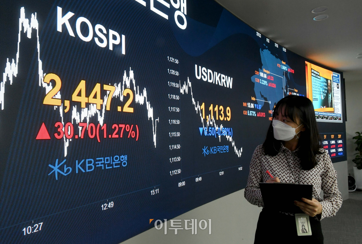 9일 코스피 지수가 ‘바이든 랠리’에 1.2% 올라 연고점을 경신했다. 이는 종가 기준 지난 9월15일 2443.58 이후 연고점이자 2018년 6월12일(2468.83) 이후 2년 5개월 만에 가장 높은 수준이다. 이날 서울 여의도 KB국민은행 딜링룸 전광판에 코스피가 전 거래일보다 30.7포인트(1.27%) 오른 2447.2를 가리키고 있다.