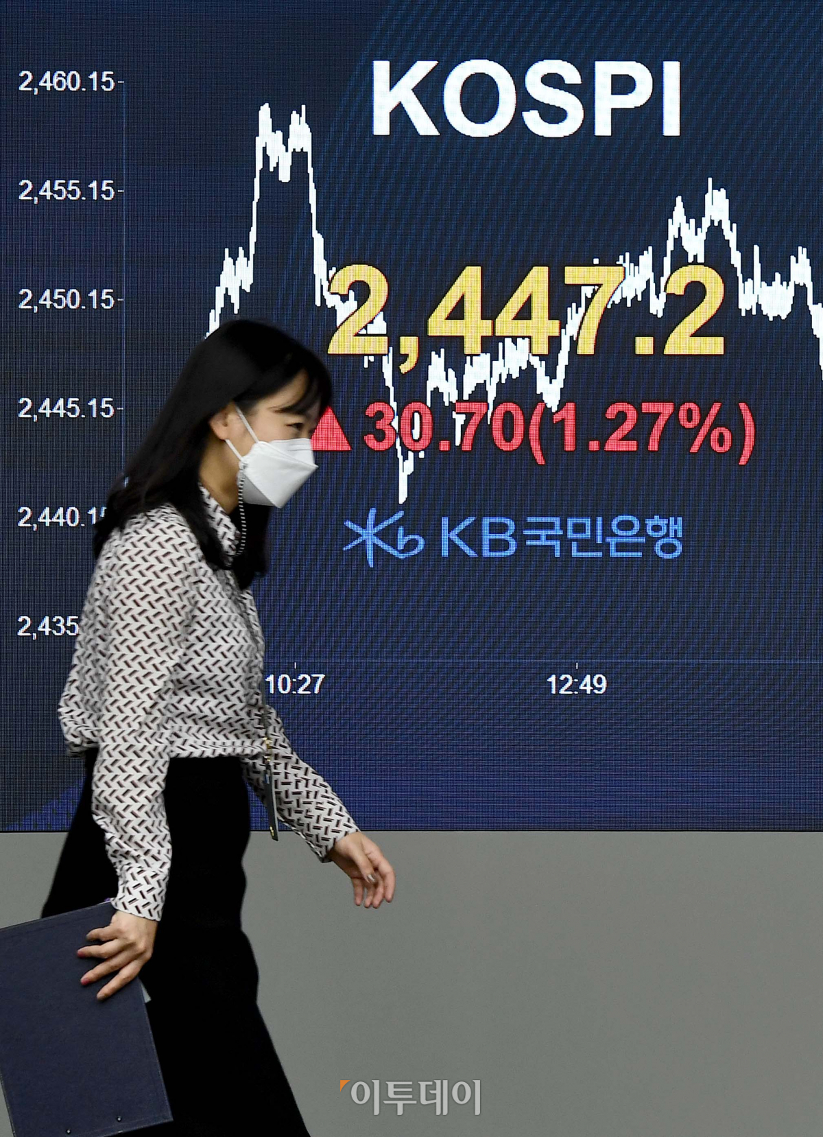 9일 코스피 지수가 ‘바이든 랠리’에 1.2% 올라 연고점을 경신했다. 이는 종가 기준 지난 9월15일 2443.58 이후 연고점이자 2018년 6월12일(2468.83) 이후 2년 5개월 만에 가장 높은 수준이다. 이날 서울 여의도 KB국민은행 딜링룸 전광판에 코스피가 전 거래일보다 30.7포인트(1.27%) 오른 2447.2를 가리키고 있다.