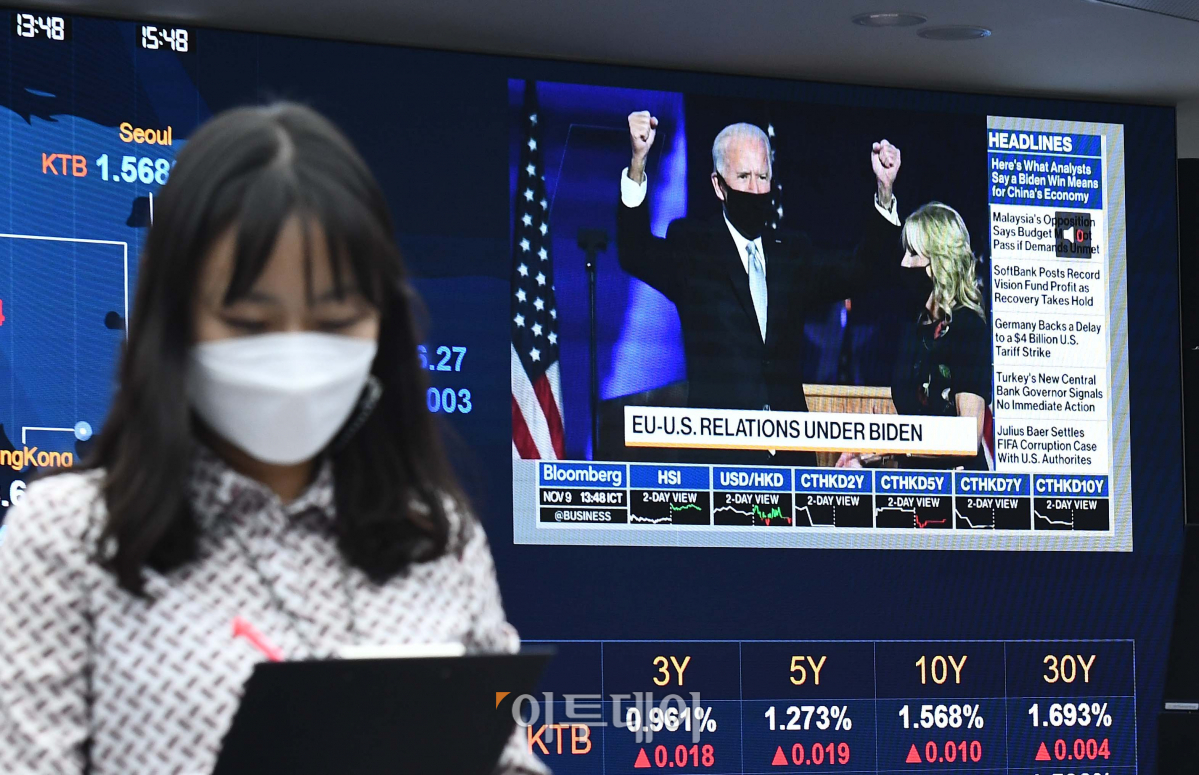 9일 코스피 지수가 ‘바이든 랠리’에 전일 대비 30.7포인트(1.27%) 오른 2447.2로 마감했다. 이는 종가 기준 지난 9월15일 2443.58 이후 연고점이자 2018년 6월12일(2468.83) 이후 2년 5개월 만에 가장 높은 수준이다. 이날 서울 여의도 KB국민은행 딜링룸 전광판에 조 바이든 미국 대통령 당선인의 모습이 나오고 있다.
