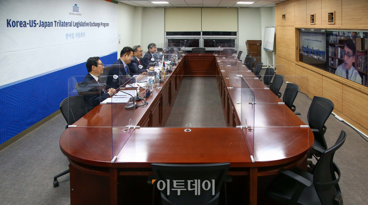 10일 국회 의원회관 1간담회실에서 ‘미국 대선결과의 영향 및 미·중 관계’를 주제로 제28차 한미일 의원회의가 화상으로 진행되고 있다.