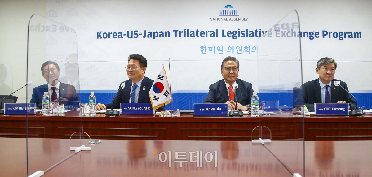 10일 국회 의원회관 1간담회실에서 ‘미국 대선결과의 영향 및 미·중 관계’를 주제로 제28차 한미일 의원회의가 화상으로 진행되고 있다. 왼쪽부터 더불어민주당 김한정 의원, 송영길 의원, 국민의힘 박진 의원, 조태용 의원.