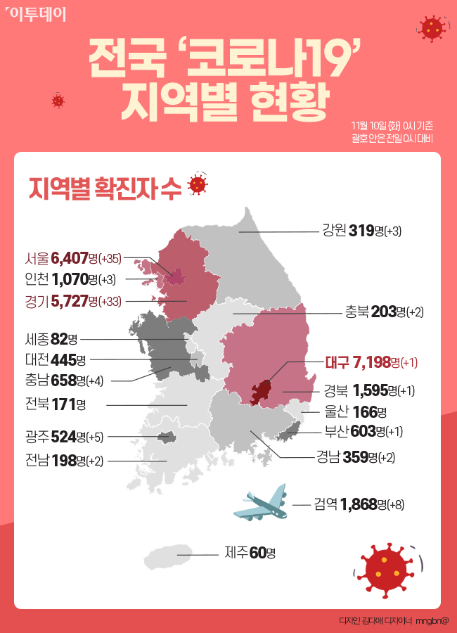 이로써 전국 시·도별 '코로나19' 확진자 수는 △대구 7198명 △서울 6407명으로 가장 많은 비중을 차지했다. 이어 △경기 5727명 △검역소 1868명 △경북 1595명 △인천 1070명 △충남 658명 △부산 603명 △광주 524명 △대전 445명 △경남 359명 △강원 319명 △충북 203명 △전남 198명 △전북 171명 △울산 166명 △세종 82명 △제주 60명 순으로 나타났다.