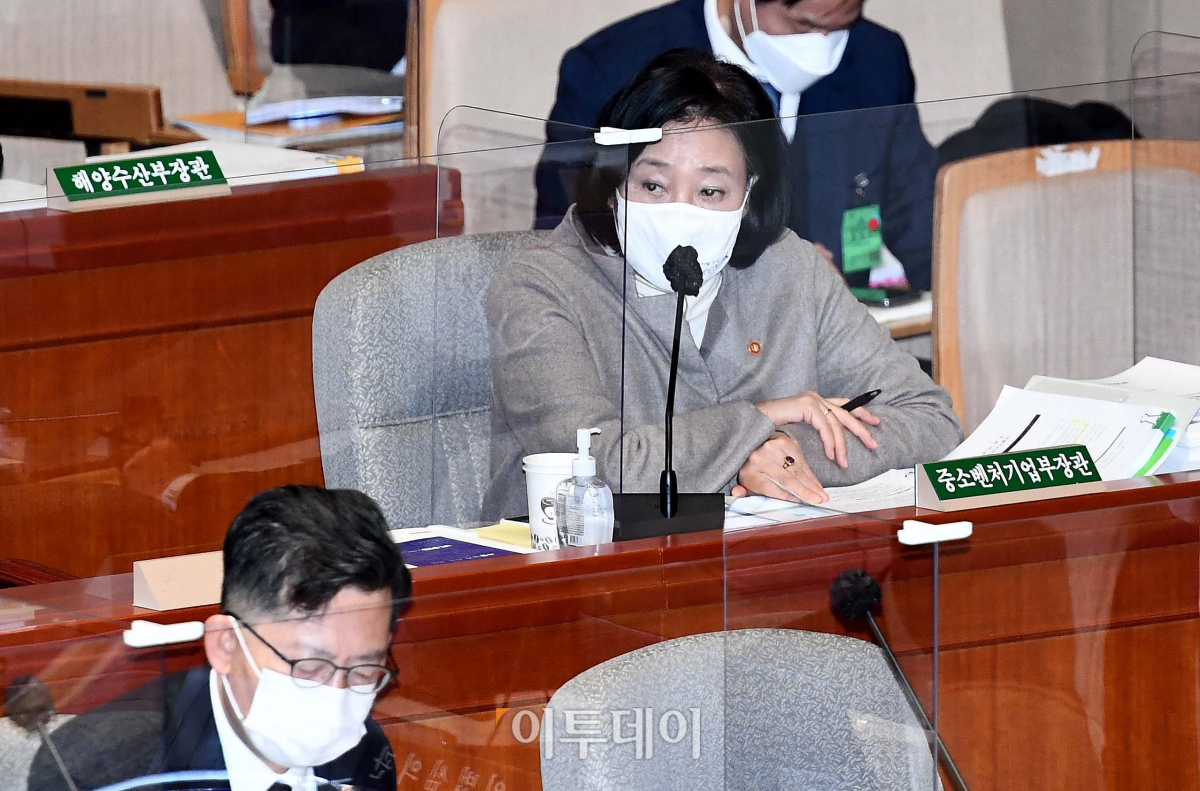 박영선 중소벤처기업부 장관이 10일 서울 여의도 국회에서 열린 예산결산특별위원회 전체회의에서 의원의 질의에 답하고 있다.