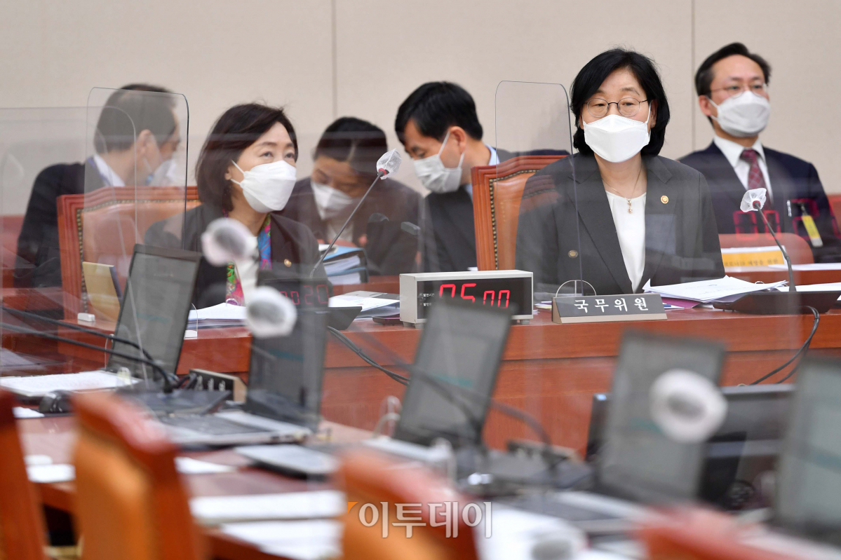 이정옥 여성가족부 장관이 10일 오전 서울 여의도 국회에서 열린 여성가족위원회 전체회의에서 야당이 이 장관의 '성인지 학습 기회' 발언을 두고 사퇴 촉구 등 비판이 이어지면서 정회된 이후 속개를 기다리고 있다.