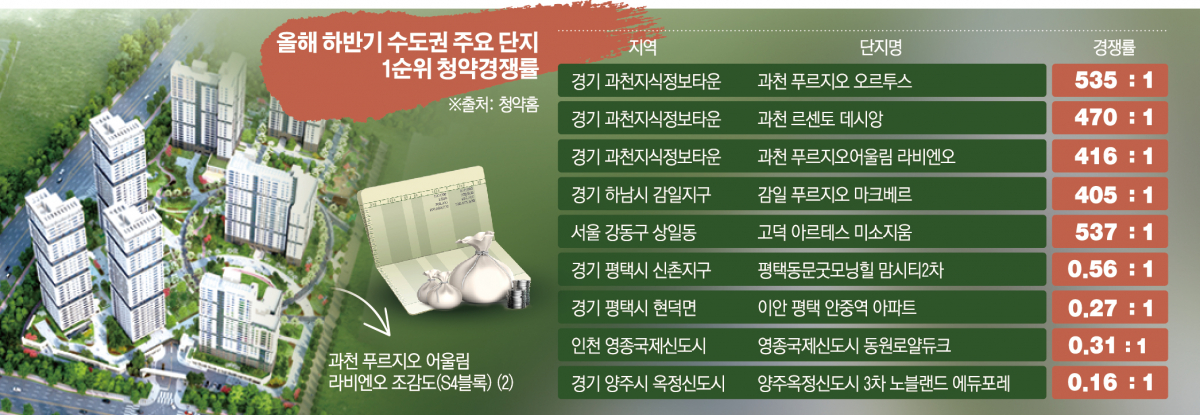 이번 주 당첨자를 발표하는 '과천 푸르지오 오르투스', '과천 르센토 데사앙' 역시 청약가점 벽은 상당히 높을 것으로 보인다. 이들 3개 단지 청약에 움직인 수요는 특별공급을 합쳐 57만 명에 달했다. 하남시 감일지구에서 나온 '감일 푸르지오 마크베르'를 더하면 최근 4개 단지에만 무려 71만 명의 청약자가 줄을 섰다.