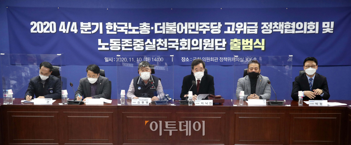 이낙연 더불어민주당 대표가 10일 서울 여의도 국회에서 열린 2020 4/4분기 한국노총·더불어민주당 고위급 정책협의회 및 노동존중실천국회의원단 출범식에서 발언하고 있다. 이 대표 왼쪽은 김동명 한국노총 위원장.