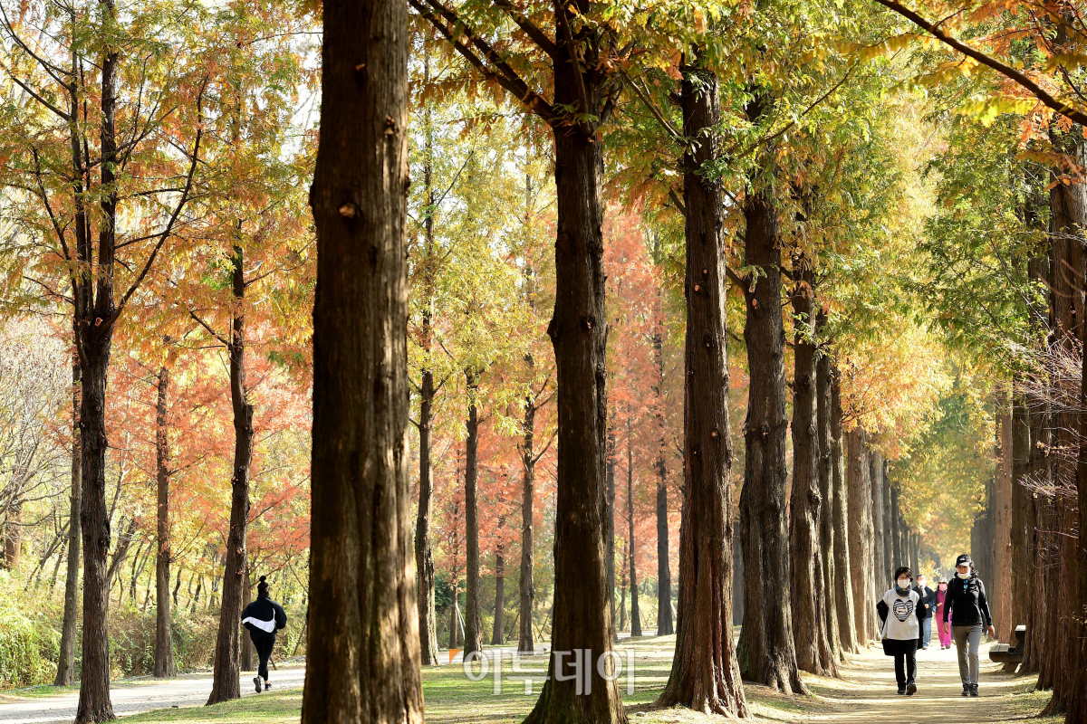 서울 낮 기온이 17도를 기록하는 등 전국이 포근한 날씨를 보인 12일 서울 마포구 하늘공원 메타세쿼이아길에 펼쳐진 만추의 풍경이 계절의 정취를 전하고 있다. 기상청은 당분간 평년 기온을 웃도는 온화한 날씨가 이어질 것으로 전망했다. 서울시는 코로나19 확산 방지를 위해 한시적으로 폐쇄했던 하늘공원을 지난 9일부터 재개방했다.