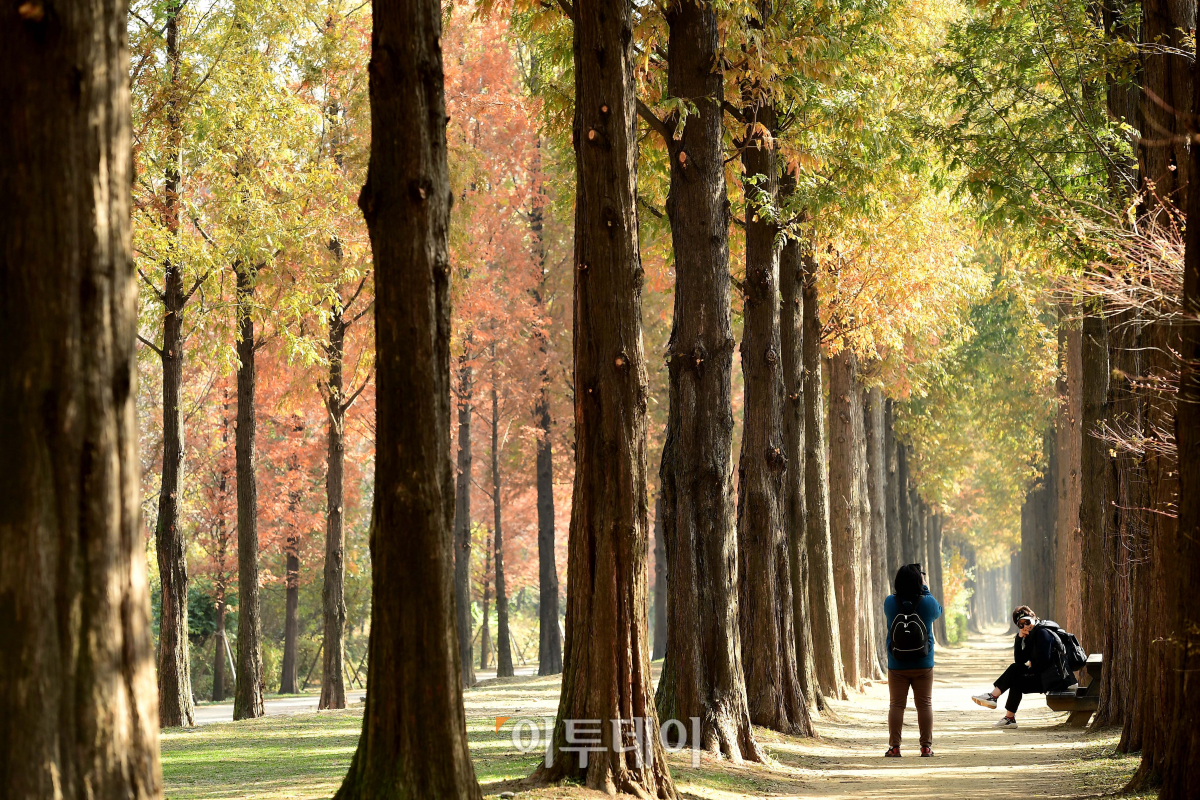 서울 낮 기온이 17도를 기록하는 등 전국이 포근한 날씨를 보인 12일 서울 마포구 하늘공원 메타세쿼이아길에 펼쳐진 만추의 풍경이 계절의 정취를 전하고 있다. 기상청은 당분간 평년 기온을 웃도는 온화한 날씨가 이어질 것으로 전망했다. 서울시는 코로나19 확산 방지를 위해 한시적으로 폐쇄했던 하늘공원을 지난 9일부터 재개방했다.