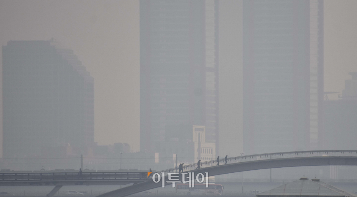 수도권 지역을 중심으로 전국 곳곳에 미세먼지가 ‘나쁨’ 수준을 보인 13일 서울 한강공원에서 바라본 도심이 뿌옇다.