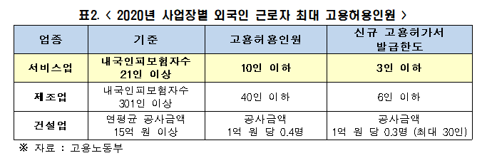 정부는 고용허가제를 통해 외국인 근로자를 고용할 수 있는 업종을 선별한다. 외국인 고용 도입업종 및 인원 등 세부사항은 2004년부터 매년 ‘외국인력정책위원회’에서 심의·의결된다.