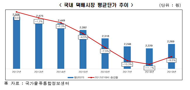 이러한 택배시장의 성장에도 불구하고 택배평균단가는 지속적인 내림세를 보인다. 택배평균단가는 1997년 1박스당 4732원을 정점으로 2018년에는 2229원까지 떨어졌다가, 지난해 2269원으로 소폭 반등했지만, 올해 하락 추세를 벗어나기 어려울 것으로 전망된다.