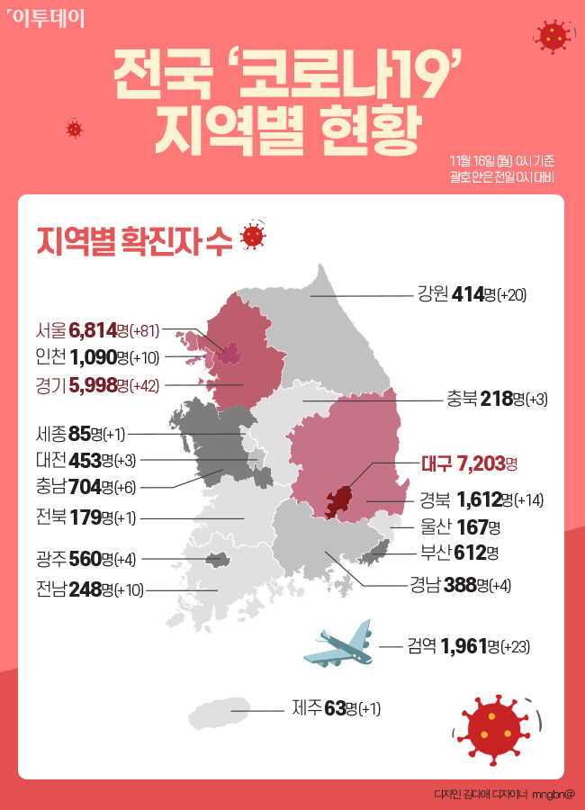 이로써 전국 시·도별 '코로나19' 확진자 수는 △대구 7203명 △서울 6814명으로 가장 많은 비중을 차지했다. 이어 △경기 5998명 △검역소 1961명 △경북 1612명 △인천 1090명 △충남 704명 △부산 612명 △광주 560명 △대전 453명 △강원 414명 △경남 388명 △전남 248명 △충북 218명 △전북 179명 △울산 167명 △세종 85명 △제주 63명 순으로 나타났다.