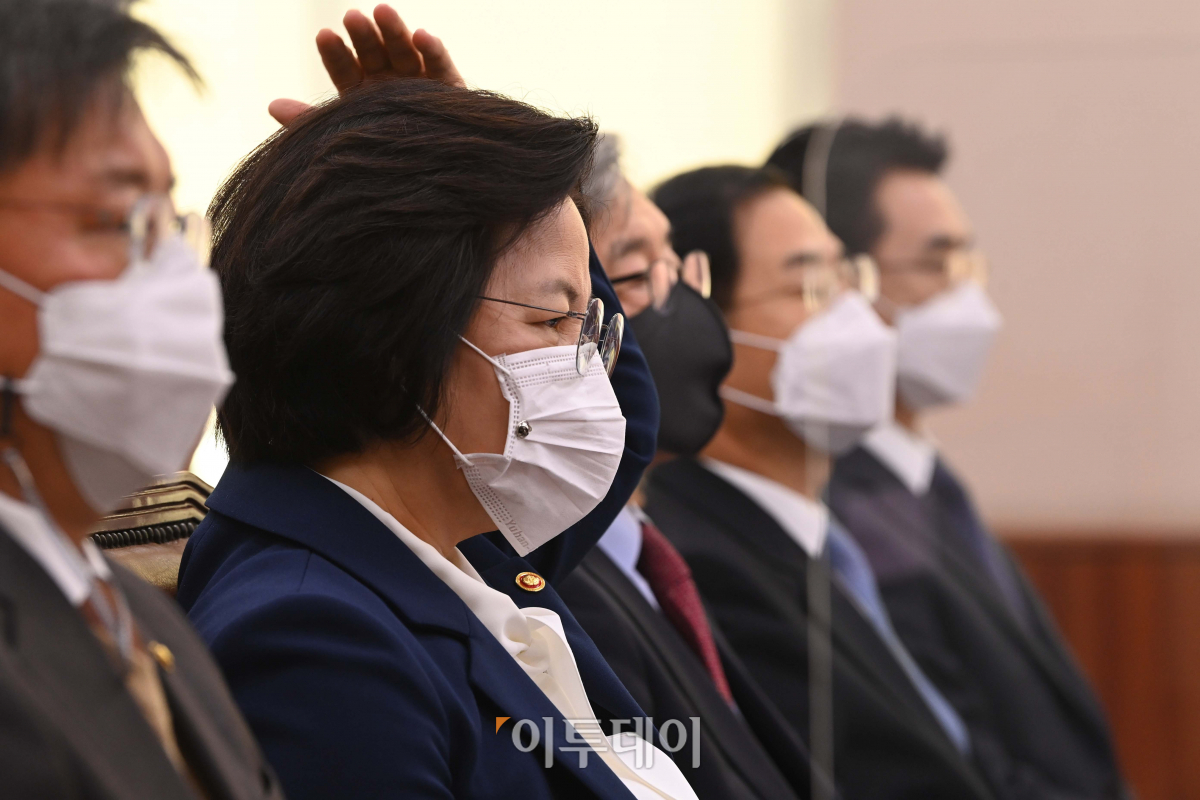 16일 오전 국회에서 열린 법제사법위원회 전체회의에서 추미애 법무부 장관이 머리를 만지고 있다.