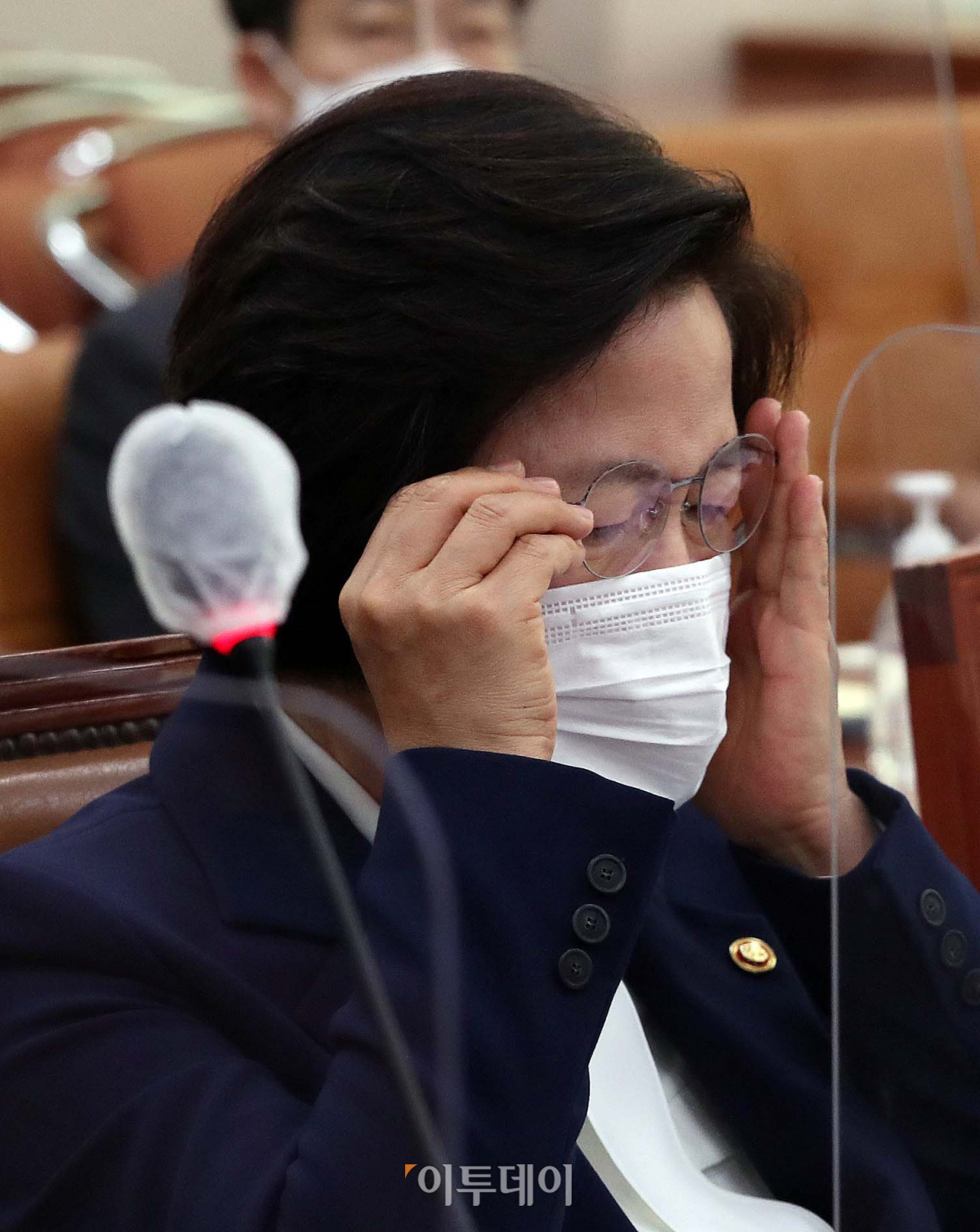 추미애 법무부 장관이 16일 오전 서울 여의도 국회에서 열린 법제사법위원회 전체회의에 출석해 안경을 고쳐쓰고 있다.