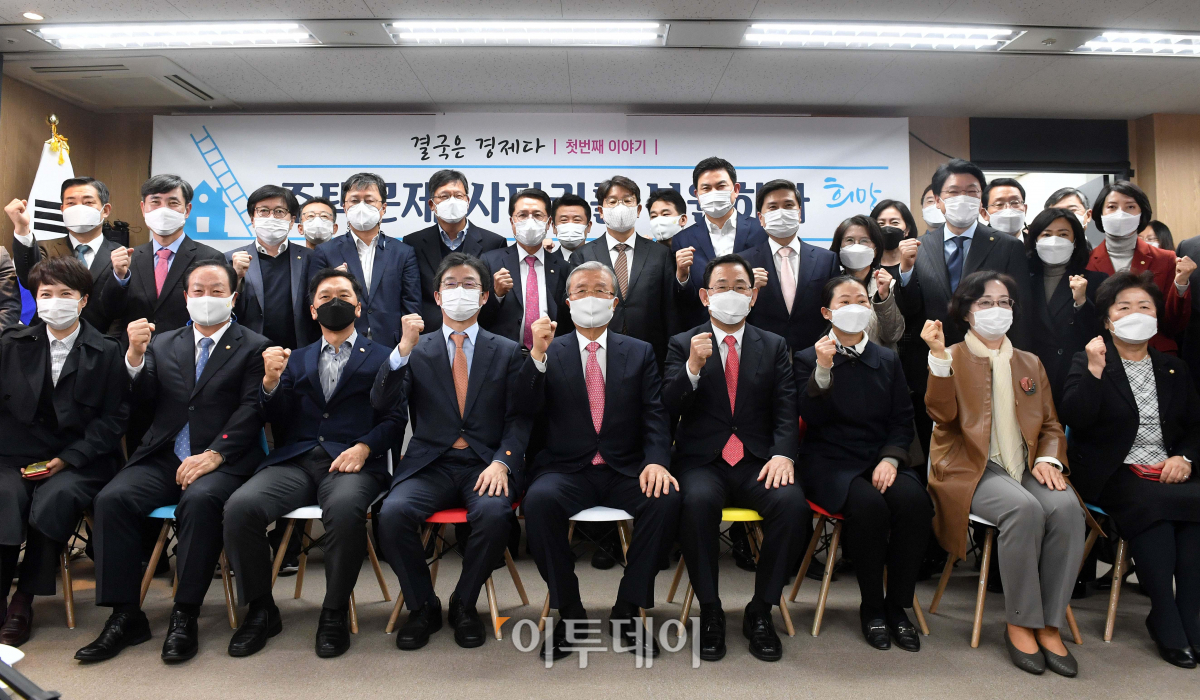 16일 서울 여의도 국회 앞 태흥빌딩에 마련된 유승민 전 의원의 '희망 22' 사무실에서 '결국 경제다'를 주제로 열린 '주택문제, 사다리를 복원하다' 토론회에서 김종인 국민의힘 비대위원장과 주호영 원내대표, 유승민 전 의원 등 참석자들이 기념촬영을 하고 있다.