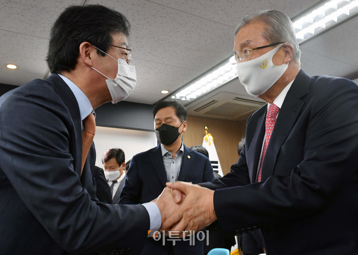 김종인 국민의힘 비대위원장이 16일 서울 여의도 국회 앞 태흥빌딩에 마련된 유승민 전 의원의 '희망 22' 사무실에서 '결국 경제다'를 주제로 열린 '주택문제, 사다리를 복원하다' 토론회에 참석해 기념촬영을 끝난 뒤 유 전 의원과 인사하고 있다.