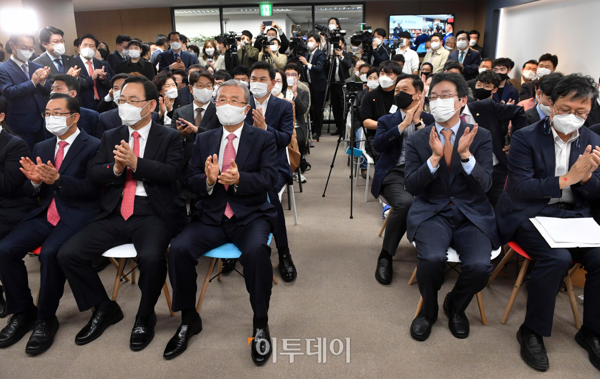 16일 서울 여의도 국회 앞 태흥빌딩에 마련된 유승민 전 의원의 '희망 22' 사무실에서 '결국 경제다'를 주제로 열린 '주택문제, 사다리를 복원하다' 토론회에서 김종인 국민의힘 비대위원장과 주호영 원내대표, 유승민 전 의원 등 참석자들이 박수를 내빈 소개를 들으며 박수치고 있다.
