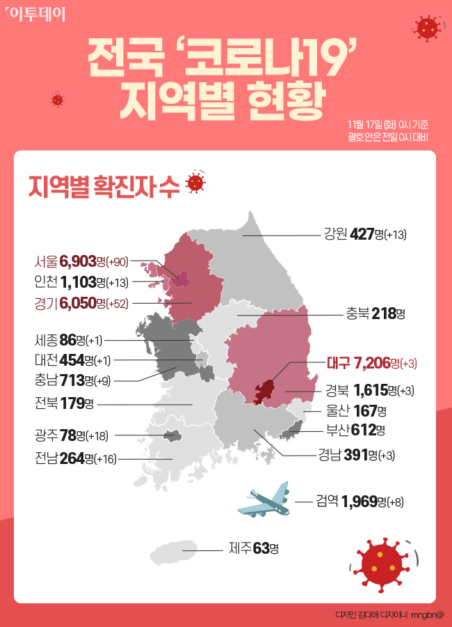이로써 전국 시·도별 '코로나19' 확진자 수는 △대구 7206명 △서울 6903명으로 가장 많은 비중을 차지했다. 이어 △경기 6050명 △검역소 1969명 △경북 1615명 △인천 1103명 △충남 713명 △부산 612명 △광주 578명 △대전 454명 △강원 427명 △경남 391명 △전남 264명 △충북 218명 △전북 179명 △울산 167명 △세종 86명 △제주 63명 순으로 나타났다.