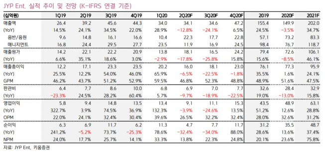 그러면서 "작년 트와이스 돔 공연, GOT7 월드투어 등 콘서트 미개최로 인한 매출 감소는 코로나19 상황이 진정되면 정상적인 개선을 예상할 수 있는 부분"이라며 "포스트 코로나 시대에 높은 실적 성장성을 기대한다"고 내다봤다.